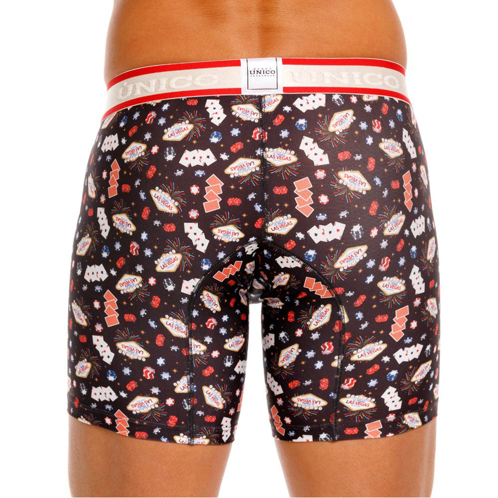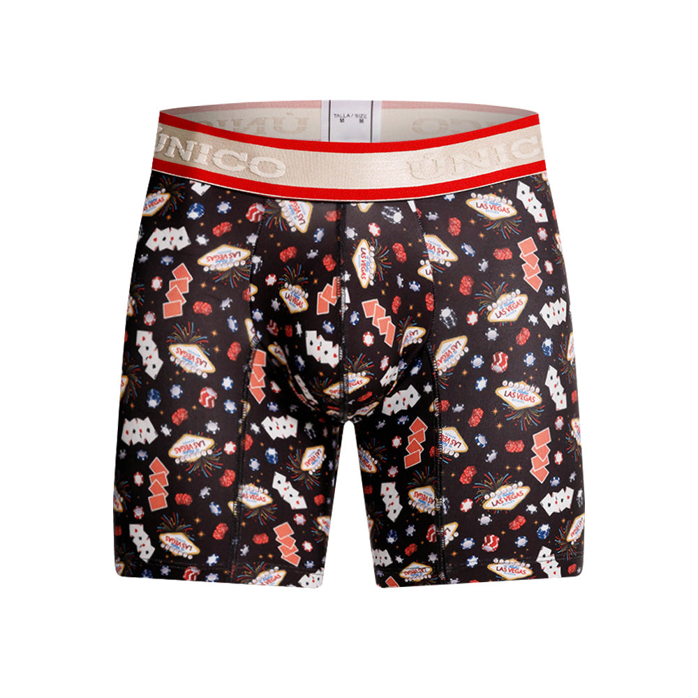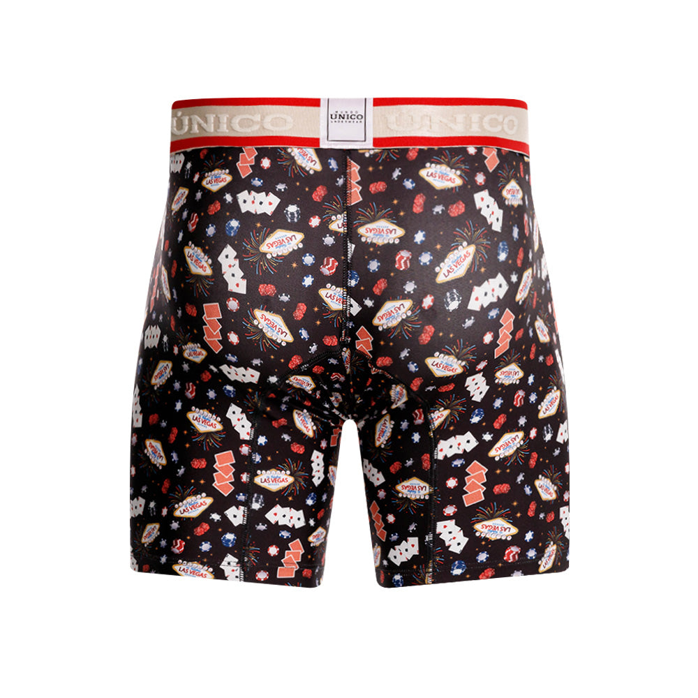Color: Estampado de elementos de casino, con elástico gris contramarcado con detalles rojos.