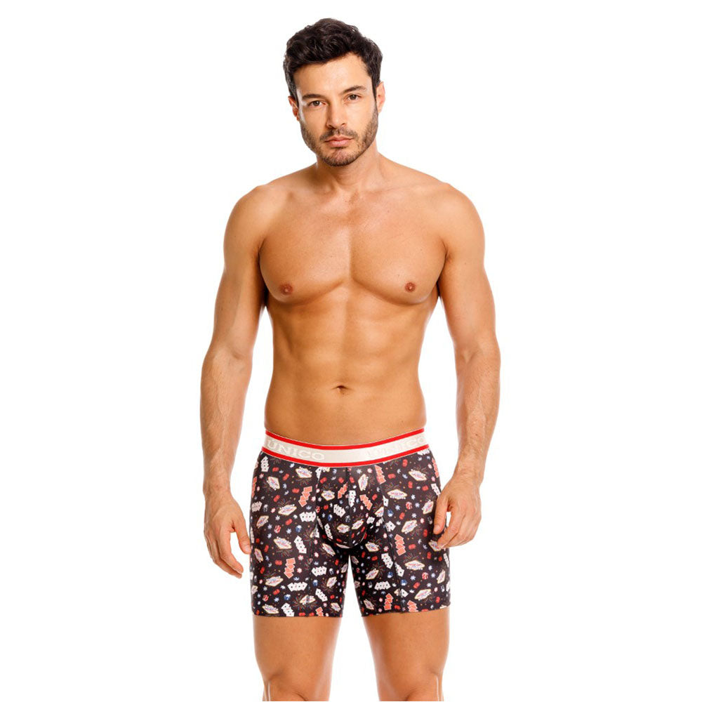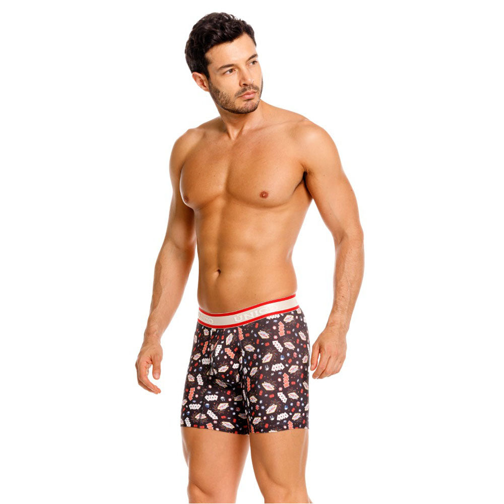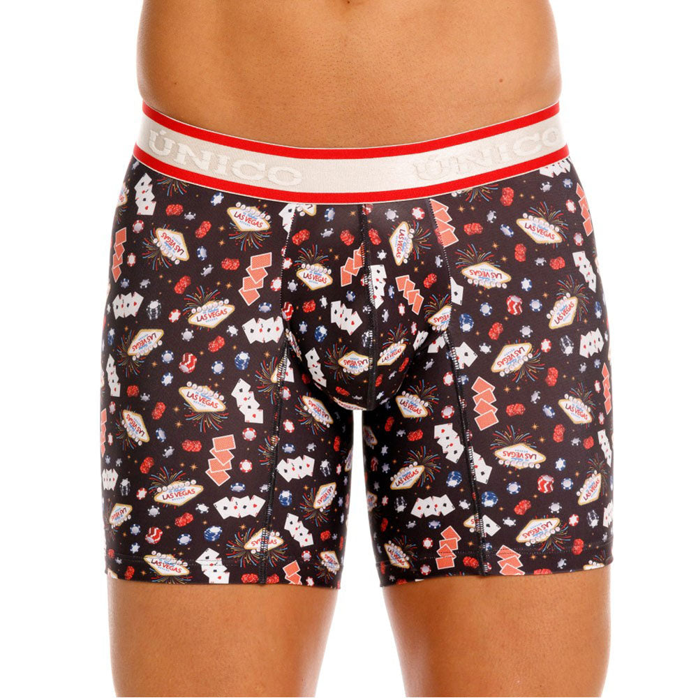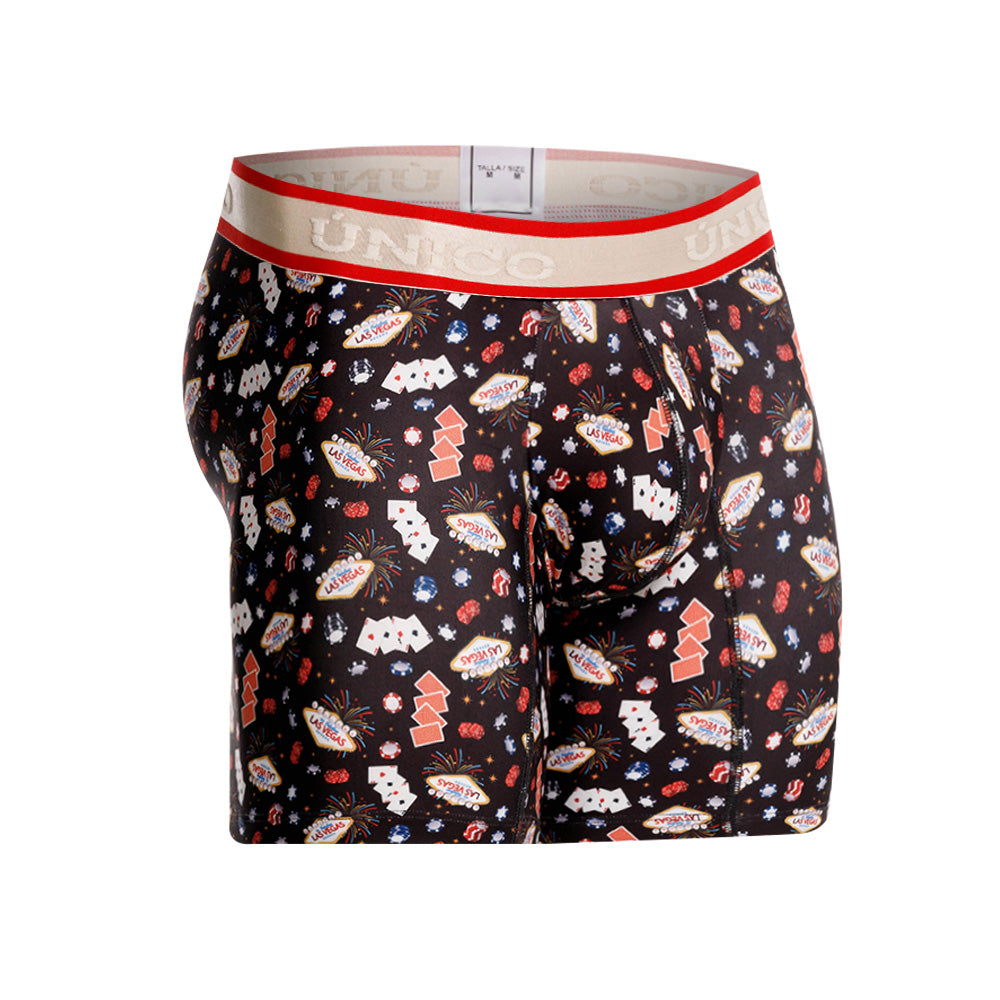 Color: Estampado de elementos de casino, con elástico gris contramarcado con detalles rojos.