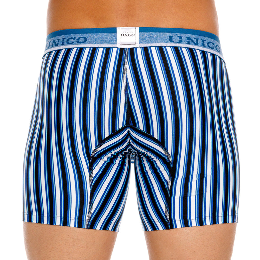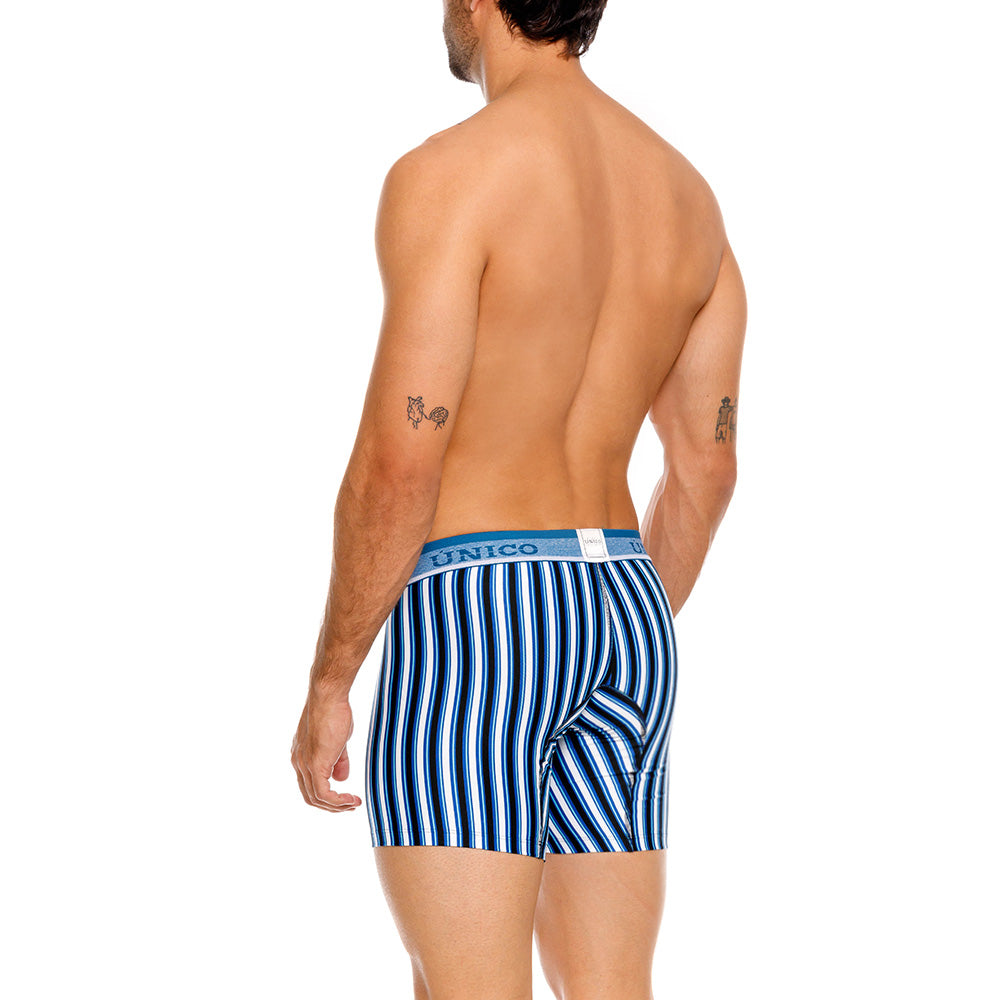 Color: Rayas blancas, azules y negras con elástico azul contramarcado con detalles blancos.